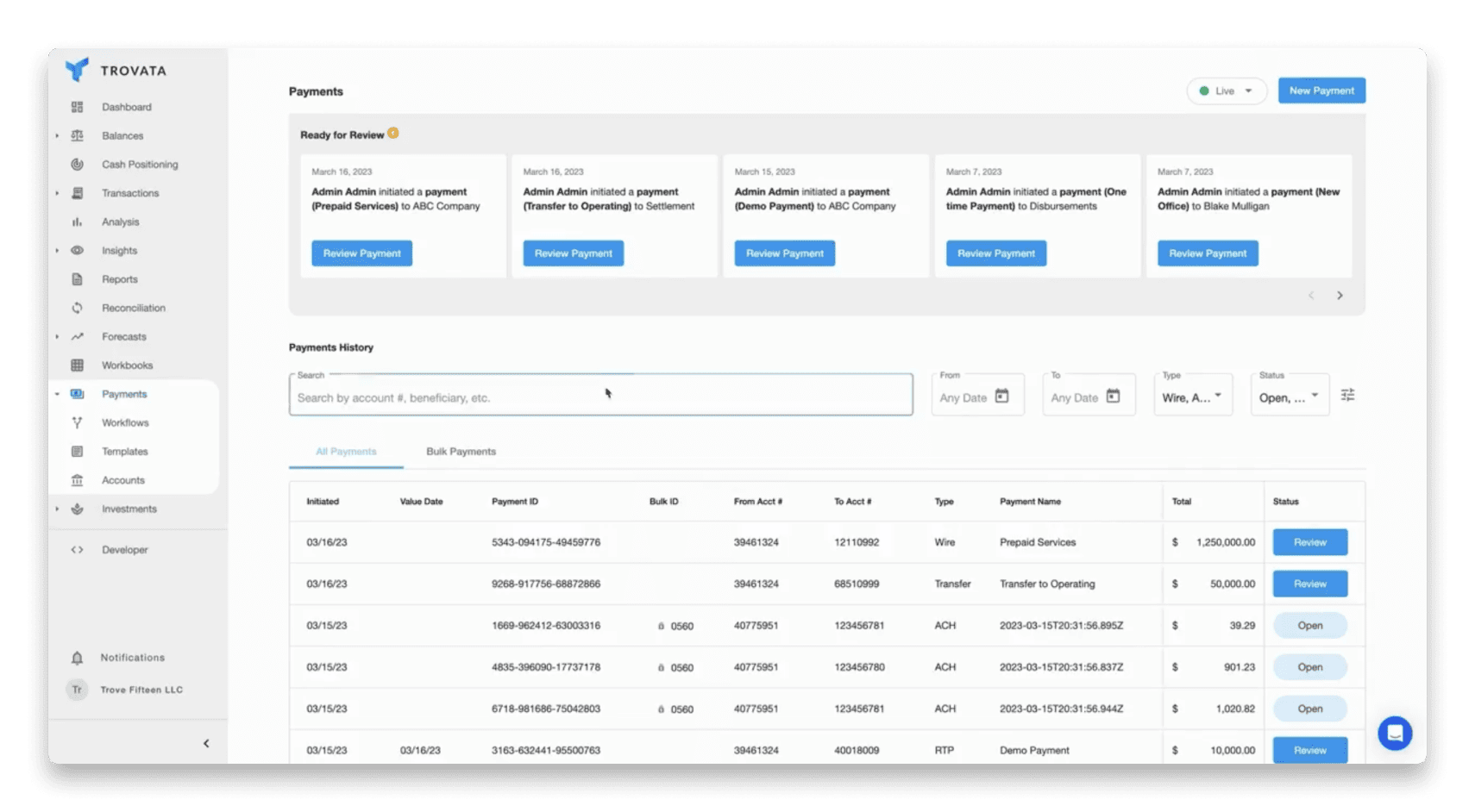 Even better, APIs can work both ways, allowing treasurers to initiate payments across all of their entities, right inside Trovata. These can be done individually, or in groups using bulk transfers. There’s no need to initiate an entirely separate process for payments across multiple entities, with APIs they can all be combined in one.