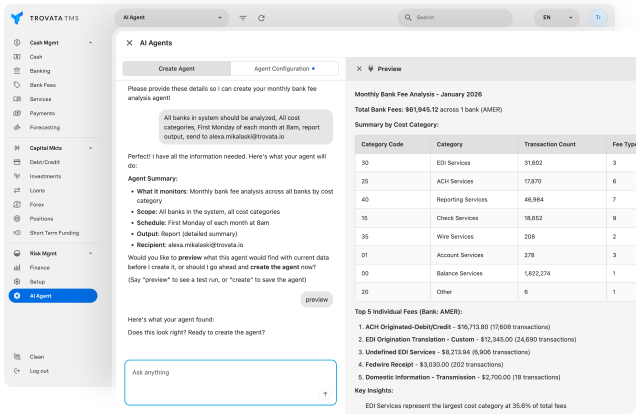 AI built directly into the Trovata treasury system of record, with full operational context